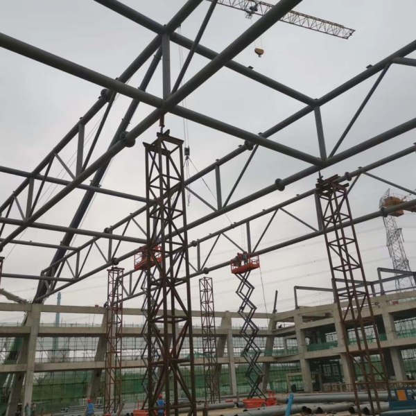 管桁架,是指用圓桿件在端部相互連接而組成的格子式結(jié)構(gòu)。桁件使桁架鋼結(jié)構(gòu)用料經(jīng)濟(jì)、結(jié)構(gòu)自重輕,易于構(gòu)成各種外形以適應(yīng)不同的用途,譬如可以做成簡(jiǎn)支桁架、拱、框架及塔架等。與網(wǎng)架結(jié)構(gòu)相比,管桁架結(jié)構(gòu)省去下弦縱向桿件和網(wǎng)架的球節(jié)點(diǎn),可滿足各種不同建筑形式的要求,尤其是構(gòu)筑圓拱和任意曲線形狀比網(wǎng)架鋼結(jié)構(gòu)更有優(yōu)勢(shì)。其各向穩(wěn)定性相同,節(jié)省材料用量。鋼管桁架鋼結(jié)構(gòu)是在網(wǎng)架結(jié)構(gòu)的基礎(chǔ)上發(fā)展起來(lái)的,與網(wǎng)架鋼結(jié)構(gòu)相比具有其獨(dú)特的優(yōu)越性和實(shí)用性,結(jié)構(gòu)用鋼量也較經(jīng)濟(jì)。與傳統(tǒng)的開口截面(H型鋼和I字鋼)鋼桁架相比,管桁架結(jié)構(gòu)截面材料繞中和軸較均勻分布,使截面同時(shí)具有良好的抗壓和抗彎扭承載能力及較大剛度,不用節(jié)點(diǎn)板,構(gòu)造簡(jiǎn)單。最重要的是管桁結(jié)構(gòu)外形美觀,便于造型有一定裝飾效果。管桁架鋼結(jié)構(gòu)整體性能好,扭轉(zhuǎn)剛度大且外表美觀,制作、安裝、翻身、起吊都比較容易;由冷彎薄壁型鋼制作的鋼管屋架,具有結(jié)構(gòu)輕、剛度好、節(jié)省鋼材,并能充分發(fā)揮材料強(qiáng)度等優(yōu)點(diǎn),尤其是在由長(zhǎng)細(xì)比控制的壓桿及支撐系統(tǒng)中采用更為經(jīng)濟(jì)。采用這種結(jié)構(gòu)的建筑物基本屬于公共建筑。該鋼結(jié)構(gòu)具有造型美觀(可建成平板形、圓拱形、任意曲線形)、制作安裝方便、鋼結(jié)構(gòu)穩(wěn)定性好、屋蓋剛度大、經(jīng)濟(jì)效果好等特點(diǎn)。
